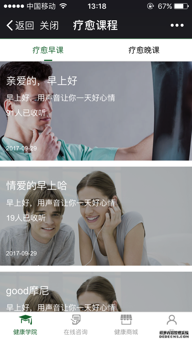 • 音频课程:课程音频上传、课程讲师、说明、价格、原价、讲师佣金等,付费课程按价格支付后可听音频。